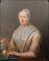 Omgeving van Christiaan van Geelen I (1755-1824), portret van Jacoba Catharina Berger (1751-1788), olieverf op doek, niet gesigneerd, laatste kwart 18e eeuw, 83 × 66,5 cm, de lijst met vier familiewapens in de hoeken: Berger, Bochove, vermoedelijk Reuffert, en De Landman, verso opschrift: 'Jakoba Catherina Berger. Geb 11 Feb 1751. Getrouwd met M.H.J. van Hengst, Griffier v d Hove Utrecht. Overl. 16 july 1788', Jacoba Catherina Berger, dochter van Cypriaan Berger, oud-burgemeester der stad Utrecht, huwde in 1770 Hendrik Jacob van Hengst, patriot en eigenaar van het buitenhuis Persijn aan de Achterwetering in Maartensdijk