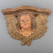 Houten polychroom beschilderde wandconsole: cherubijn, eerste helft 18e eeuw -enkele plekjes verfverlies, krimpscheur onder kinnetje-, 40 × 52 × 23 cm