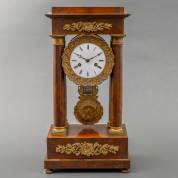 Mahonie kolompendule, de geëmailleerde wijzerplaat met Romeinse cijfers, en bronzen beslag, Frankrijk, midden 19e eeuw -sleutel bijgevoegd-, 49,5 × 26 × 15 cm