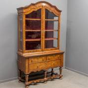 Wortelnotengefineerde porseleinkast met drie lades in de onderkast, marriage van Louis Quatorze onderkast en bovenkast van later datum -barstje in hoek van glas, stuk van regel tussen poten ontbreekt, en andere defecten- 220 × 126 × 54 cm