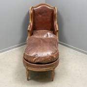 Bruin lederen oorfauteuil met notenhouten frame en bijbehorende voetenbank, Louis Seize-stijl -gebruikssporen-, samen circa 115 × 70 × 200 cm