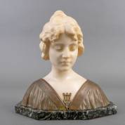 Prof. Alfredo Neri (1862-1928), marmeren en bronzen vrouwenbuste met harpvormig borstornament, op groen natuurstenen basement, aan achterzijde gesigneerd, 29 × 28 cm