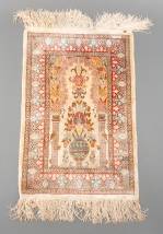Turks zijden tapijtje Hereke met bloemenvaasdecor en signatuur, 70 × 46 cm