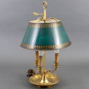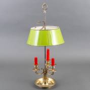 Messing drielichts bouillottelamp met resten van verzilvering en groengeschilderde blikken kap, 19e eeuw, 67 × Ø 30 cm