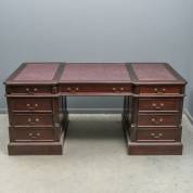 Mahonie schrijftafel met zijbladen, de zijbladen en het blad met groenleder ingelegd -mahonie deels verkleurd door zonlicht-, afmetingen met uitgeklapte zijbladen 76 × 194,5 × 75 cm, daarbij: mahonie bureaustoel met gecapitonneerde groen lederen bekleding, op wieltjes, 110 × 61 × 70 cm