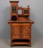 Noten buffetkast met in de opstand twee beglaasde deurtjes, waarvan één met bloemdecor, en in het midden een spiegeltje, de twee deuren in de onderkast met gesneden en gestoken bloemdecor, art nouveau -krimpscheuren in het blad-, 198 × 109 × 54 cm