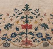 Geborduurd fragment van een overjapon met bloemdecor, circa derde kwart 18e eeuw, in lijst, 53 × 155 cm