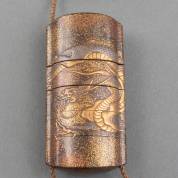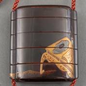 Japanse lakwerk vierlaags inro met parelmoer inlegwerk, de ene zijde met decor van een schrijftafel, de andere zijde met decor van een waterval, aan de onderzijde gesigneerd: Tsuchida Soetsu in zijn 82ste jaar, 18e eeuw -kleine restauratie aan de rechter zijkant-, 6 × 5,5 × 2 cm