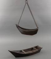 Japans bronzen ikebana vaas in de vorm van een boot, aan ketting, en een Japans bronzen modelboot, mogelijk ook voor ikebana, beide 20e eeuw -gebruikssporen-, 11 × 45 × 14 cm