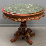 Ronde houten tafel op vierspantpoot met natuurstenen blad en bronzen beslag, 20e eeuw, 80 × Ø 100 cm