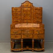 Notenhouten 'Aufsatz' secretaire met gebogen front en opstand voorzien van inlegwerk, staand op open onderstel met regelverbinding, Duitsland, eerste helft 18e eeuw, 170 × 113 × 80 cm, herkomst; Sotheby's Amsterdam, 1996, veiling 0640, kavelnummer 1096, kopie factuur aanwezig