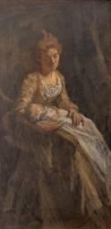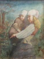 Toegeschreven aan Willem Matthijs Maris (1872-1929), moeder met kind, olieverf op doek, r.o. resten van signering en datering -gedoubleerd, enkele inschilderingen, met name langs de randen-, 61,5 × 31,5 cm