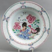 Diepe Chinees porseleinen schotel met famille rose decor van twee hanen omgeven door bianco sopra bianco bloemenrand, Yongzheng -gelijmde breuk in rand-, Ø 36,5 cm