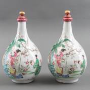 Paar Japans porseleinen bedekte flessen met famille rose decor van figuren in tuin, 19e eeuw, 30 cm hoog
