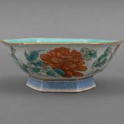 Chinees porseleinen hexagonale famille rose kom met floraal decor en turquoise binnenzijde, gemerkt, 19e eeuw, 8,5 × 22 × 20 cm