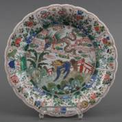 Chinees porseleinen plooischotel met famille verte decor van qilin en feniks, zegelmerk Zhi, Kangxi -gerestaureerd-, Ø 27 cm