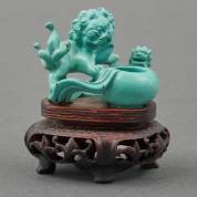 Gesneden turkoois penselenwasser: twee tempelleeuwen, eind 19e eeuw, op houten basement, hoogte inclusief basement 6,5 cm