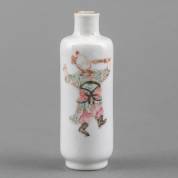 Chinees porseleinen snuifflesje met famille rose decor van een krijger uit de Wu Shuang Pu en een vers, 19e eeuw -dopje ontbreekt-, 9 × Ø 3 cm