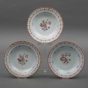 Drie Chinees porseleinen famille rose diepe borden met 'Lowestoft' floraal decor, de randen met guirlandes, 18e eeuw -kleine randschilfers-, Ø 23 cm