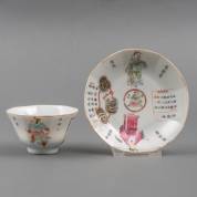 Octagonaal Chinees porseleinen kommetje en schoteltje met polychroom decor van twee helden uit de Wu Shuang Pu, Xianfeng zegelmerk en periode, 6 × 13,5 cm