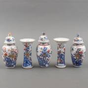 Vijfdelig Chinees porseleinen kaststelletje met Imari bloemdecor, bestaande uit drie dekselvaasjes en twee trompetvaasjes, 18e eeuw -chips, haarlijn-, hoogte dekselvaasjes 17 cm