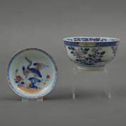 Chinees porseleinen schoteltje met famille rose decor: kraanvogel, 18e eeuw -randchipje-, daarbij Chinees porseleinen kommetje met famille rose floraal decor, 20e eeuw, gemerkt, 6 × Ø 11,5 cm