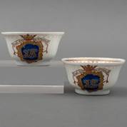 Paar Chinees porseleinen kommetjes met verguld en blauwgeëmailleerd decor: gekroond monogram met motto, 18e eeuw -één met randchips, beide met randschilfertjes-, 5 × Ø 10 cm, herkomst: privécollectie van kunsthandelaar Abraham van der Meer (1927-2008), destijds gevestigd op de Spiegelgracht 3 te Amsterdam
