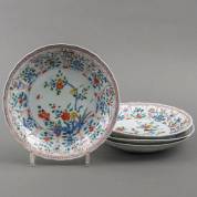 Vier Chinees porseleinen gecontourneerde borden met polychroom decor van vogel op bloesemtak, Kangxi -defecten-, Ø 21,5 cm