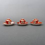 Drie Chinees porseleinen bedekte kommetjes op schoteltjes met famille rose bloemdecor in cartouches op rood fond, Qianlong -minieme chipjes, haarlijnen, één dekseltje gelijmd-, 6 × Ø 11,5 cm