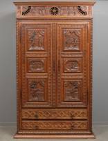 Eiken Bretonse tweedeurs kast, het opengewerkte fries en de twee deuren met gestoken taferelen uit het dagelijks leven, de onderkast met twee lades, 19e/20e eeuw -staande op plint, poten nog wel aanwezig, droogtescheuren in twee panelen-, 252 × 152 × 60 cm