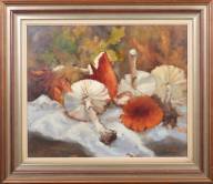 Hollandse School: stilleven met paddenstoelen, olieverf op doek, r.o. onduidelijk gesigneerd, 40 × 60 cm