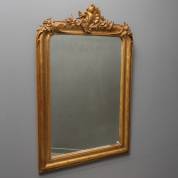 Spiegel in vergulde lijst met parelrand, afgeronde bovenhoeken, bloemdecor in reliëf en rococo-ornament, eind 19e eeuw -krasjes in glas-, 120 × 78 cm
