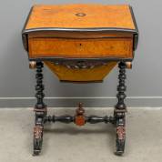 Mahonie en gezwart houten handwerkmeubel, het blad met inlegwerk, opklapbare bladen, en op wieltjes, de laatjes gevuld met handwerkbenodigdheden, Willem III, mogelijk uitgevoerd door Firma Horrix, 's-Gravenhage -blad licht gebold-, 73 × 100 × 43 cm