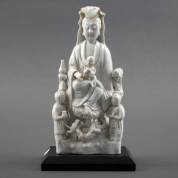 Blanc de Chine Guanyin met figuren om haar heen en een liggende draak aan haar voeten, 19e/20e eeuw -vingers afgebroken, maar deels aanwezig-, hoogte 22 cm, staand op zwart stenen basement