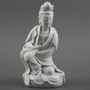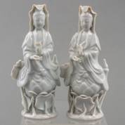 Paar Chinees porseleinen blanc de chine beeldjes: Guanyin op lotustroon, 18e/19e eeuw -chips-, 13 cm