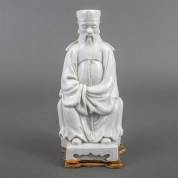 Blanc de Chine beeld: zittende hoogwaardigheidsbekleder, de buik met ingekerfd feniksdecor, de achterzijde met ingekerfd floraal decor, 19e eeuw -stuk van het borstlint ontbreekt-, hoogte 21 cm, staande op een op maat gemaakt papieren basement
