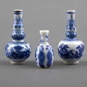 Drie Chinees porseleinen miniatuurvaasjes met blauw-wit floraal decor, Kangxi -één met glazuurschilfers-, 6,5 cm hoog