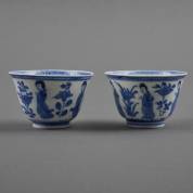 Twee Chinees porseleinen klapmutskommen met blauw-wit decor van figuren op een terras en karakters in vakken, het plat met spelende zotjes, Kangxi gemerkt en periode -chips en haarlijnen-, 7,5 × Ø 15,8 cm