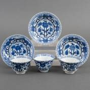 Drie Chinees porseleinen kommetjes en schoteltjes met blauw-wit bloemdecor, 19e eeuw -haarlijn, minieme randchipjes-, 6,5 × Ø 13 cm