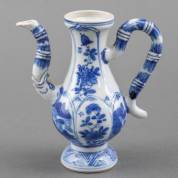 Chinees porseleinen kannetje met blauw-wit decor van landschappen en bloemen in lotusbladvormige cartouches, Kangxi -tuit gelijmd-, hoogte 11 cm