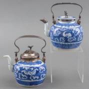 Paar Chinees porseleinen theepotjes met blauw-wit decor: vogel in de wolken, voorzien van 2e gehalte zilveren monturen, jaarletters 1853 en 1861, 10 × Ø 11 cm exclusief hengsel