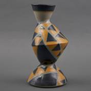 Paulien Ploeger (1958), abstracte keramische vaas uit conische vormen, met grijs, zwart en geel geometrisch decor, op onderzijde gesigneerd en gedateerd '91, 30 × 17 × 17 cm