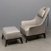 Fauteuil met lichtgrijze gestreepte bekleding op donkerbruine esdoorn poten, en bijbehorende hocker, model Normal, ontwerp Massimo Scolari, uitvoering Giorgetti, Italië -lichte gebruikssporen-