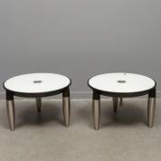 Paar ronde bijzettafeltjes met rvs en houten onderstel, de witte opaalglazen bladen in hoogte verstelbaar door middel van ronddraaien, model Roi, ontwerp Chi Wing Lo, uitvoering Giorgetti, Italië -één draaiknopje los maar aanwezig-, 35 × Ø 55 cm