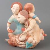 Lies van Vlijmen (1935), 'Vijf kinderen en een pingpongbal', groot keramisch plastiek, jaren '90 -beide pingpongbatjes gelijmd-, 40 × 40 × 22 cm