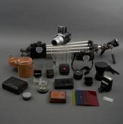 Hasselblad 500C middenformaat camera, met Sonnar 1:4 F 150mm, Carl Zeiss Planar 1:2,8 F 80mm en Carl Zeiss Distagon 1:4 F 40mm objectief, Hasselblad polaroid en mediumformaat achterwand, flitser, lichtmeter, statief, draagtas, film en accessoires -alle in gebruikte staat en met kleine defecten, film verlopen-, daarbij: bakelieten Brownie box, twee oude camera's en twee Nikon F3 camerabody's, één voorzien van motor drive -gebruikte staat-