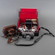 Leica fotocamera, model M3, Duitsland, summicron 35 mm lens met bril, Elmar 135 mm lens, lederen foedraal, zonnekap, twee lichtmeters, oranje filter, Kenlock houder, Metz flitser en Autoknips zelfontspanner