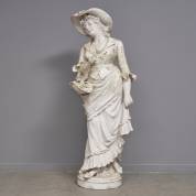 Witgeschilderd terracotta tuinbeeld: jonge vrouw met hoed en bloemenmand, op zuilvormig basement -vingers afgebroken, beetje afbladderende verf-, 250 cm hoog inclusief basement