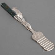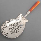 Grote 2e gehalte zilveren visschep met ajourgezaagde voluutmotieven in de bak en agaat heft, meester J.M. Anthonius, 's-Hertogenbosch, 1875, brutogewicht 112 gram, 29,2 × 10,7 cm