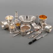 Divers 1e en 2e gehalte zilverwerk, waaronder bonbonmandje, klein flessenbakje met houten bodem en kandelaartje, brutogewicht 727 gram, bonbonmandje 13 × 9,5 × 6 cm